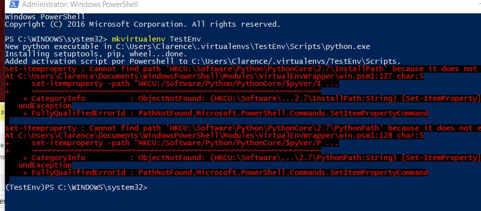 Go back to your PowerShell and start a virtual environment. This image just shows an example, but feel free to name your